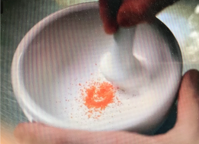 A pestle and mortar is used to grind down the solution and then the solution is ‘scraped’. The process takes about an hour and is repeated again for the second potency, but it needs to get to the 3c potency before it is soluble and purified water can be added and the dilutions continue as with the plants.